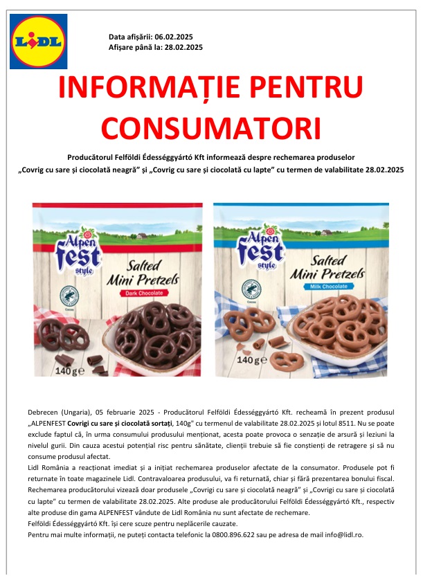 Rechemarea producătorului vizează doar produsele „Covrigi cu sare și ciocolată neagră” și „Covrigi cu sare și ciocolată cu lapte” cu termen de valabilitate 28.02.2025. Alte produse ale producătorului Felföldi Édességgyártó Kft., respectiv alte produse din gama ALPENFEST vândute de Lidl România nu sunt afectate de rechemare.